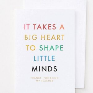 Teachers have a lot of heart. Share this thankful greeting with a teacher who has impacted your life. Front of card reads “It takes a big heart to shape little minds. Thanks for being my teacher”. Includes gold foil accents.