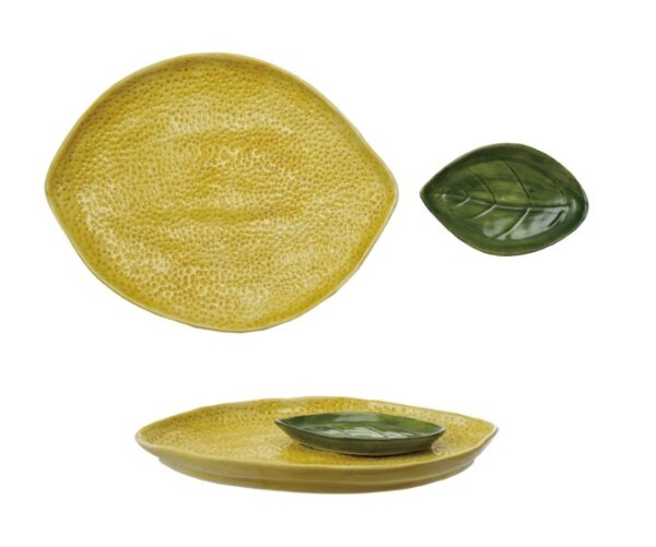 10″L x 8″W Stoneware Lemon Shaped Platter w/ 5″L x 3-1/4″W Leaf Shaped Dish, Yellow & Green, Set of 2