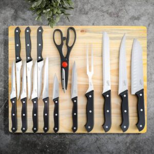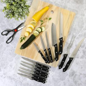 Add beauty and precision to your kitchen cutlery collection with the Gibson Home Wildcraft 15-piece Stainless Steel Cutlery Set with Pine Wood Cutting Board. This knife set features quality kitchen essentials to make meal prep easy and efficient. Each knife blade has a full tang, stainless steel blade to allow balance and leverage when cutting through thick meat or mincing garlic and herbs. The knife offers a safe and comfortable grip from the ergonomic, riveted handle. Crafted from smooth-grained pine wood, the cutting board ensures durability, perfect for everyday cooking and food prep. Handwash only.