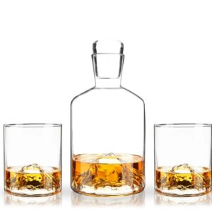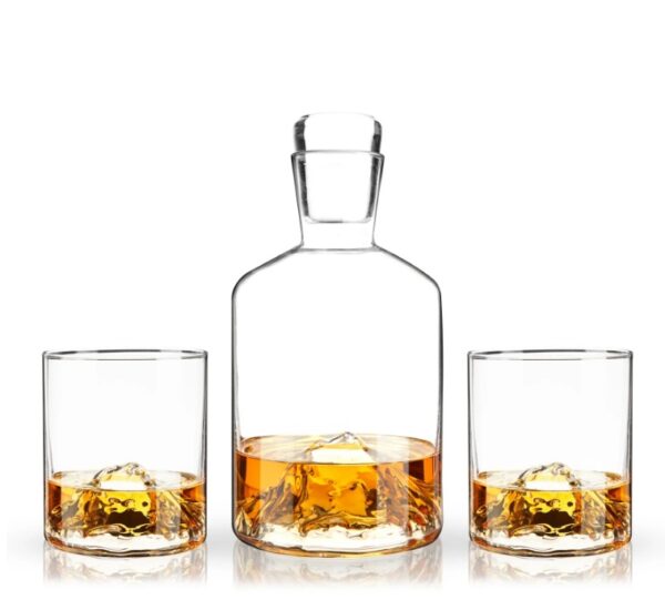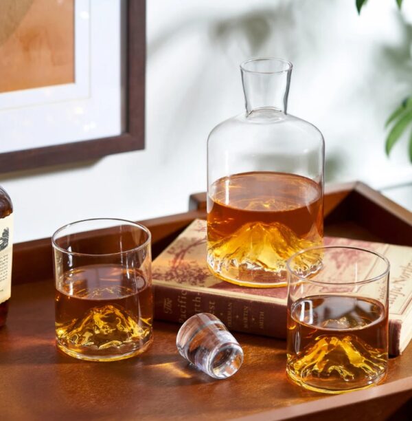 Display your liquor in style with this unique mountain decanter and tumbler set. This crystal liquor decanter set pays homage to the lofty peaks of the Pacific Northwest with a hand-blown, dimensional mountain base. These handmade items may exhibit slight variations.