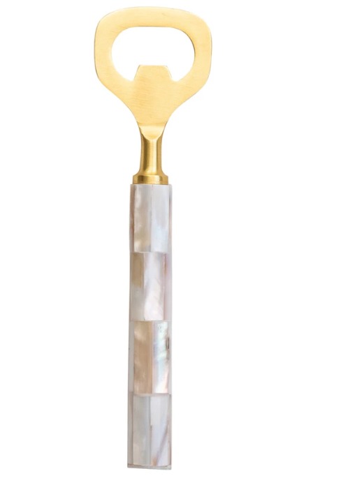 6-1/4″L Stainless Steel & Mango Wood Bottle Opener w/ Mother of Pearl Inlaid Handle, Gold Finish & Natural