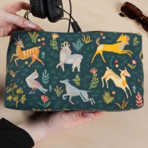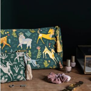 • Catch a glimpse into an enchanted realm with Danica Studio’s Boundless Large Cosmetic Bag. Highlighted in golden-yellow against the deep green of their forest abode, wild creatures prance and dance across this distinctive and versatile accessory.