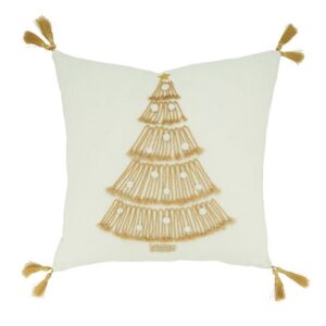 Chic and classy, this gorgeous Christmas Tree Design Throw Pillow is an elegant addition to your holiday décor. It features a beautiful golden tree on a crisp white cotton background, which instantly elevates the look and feel of any seating area. The design is perfectly finished gold tasseled corners for an ornate look.