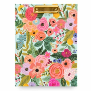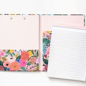 Jot down ideas and thoughts in this clipfolio with brass clip and perforated writing pad featuring Rifle’s Garden Party floral design in navy. Legal pad contains 50 tearaway lined sheets. Interior of clipfolio is blush with a coordinating floral pattern. Includes pocket for storing notes and papers. Accented with gold hardware. By Rifle Paper Co.