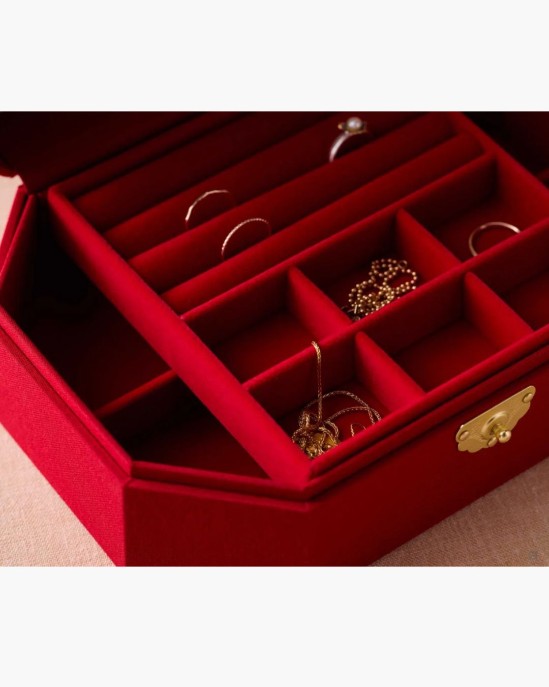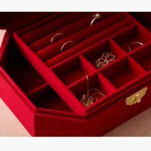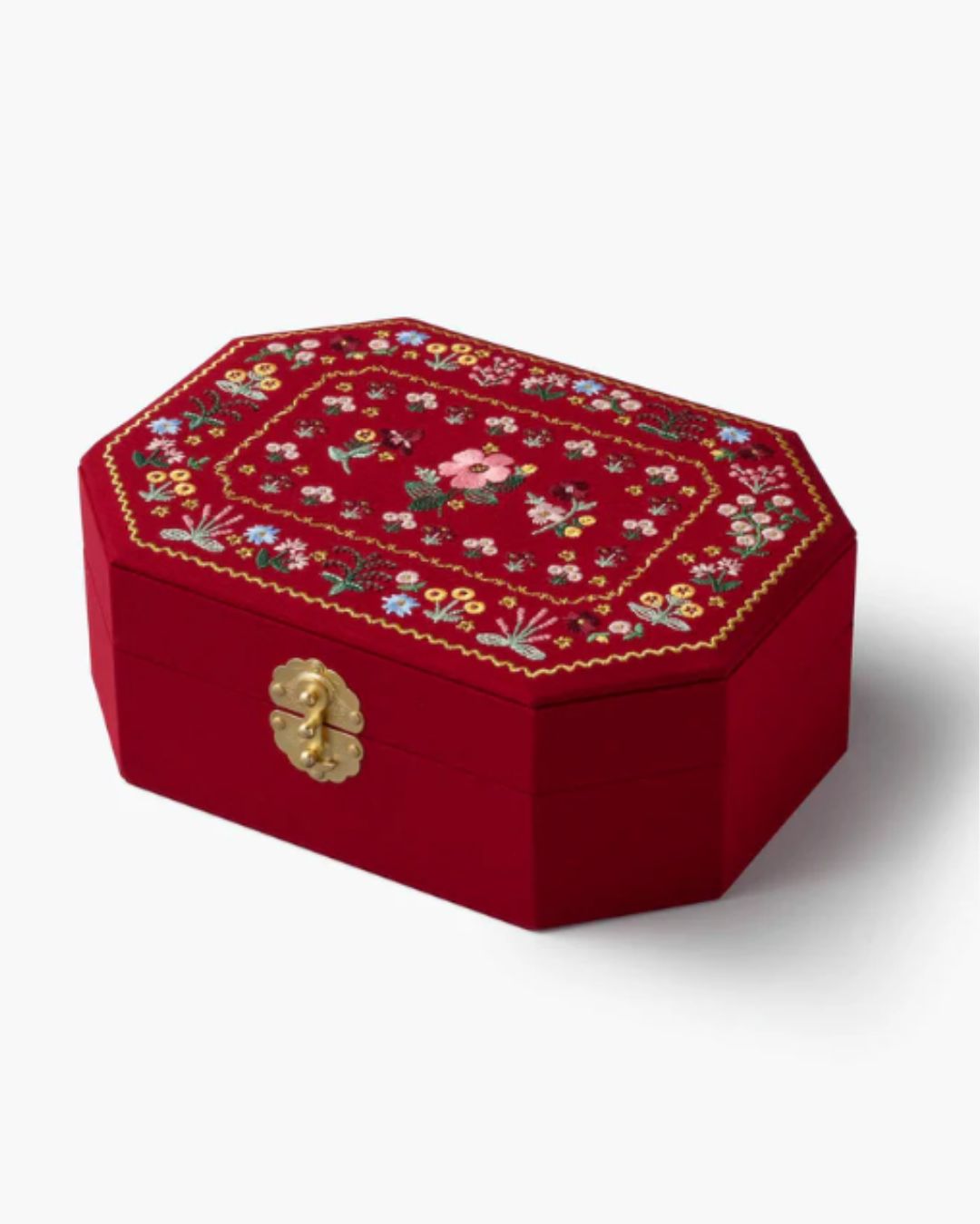 A lovely addition to your dresser or vanity, this embroidered, fabric-covered jewelry box stows your treasures in three large and six small storage sections, and features a removable tray with cushioned ring slots.Â