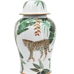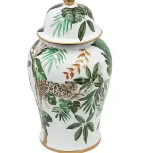 Combining the smooth, crisp charm of porcelain with the beauty of nature, this decorative ginger jar will bring both versatile function and boho style to your decor. Green leaf details coat the curved silhouette, embellished further by touches of gold on the lid, making for an accent that will elevate any room in your home. Measurements: 18 H x 9.5 D x 9.5 W.