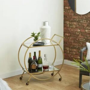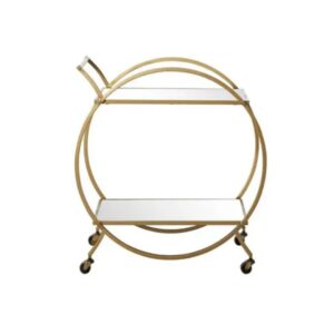 This unique bar cart showcases a matte gold frame with mirror shelving and black wheels. The serving cart features two round metal side frames and two rectangular glass mirror shelves.