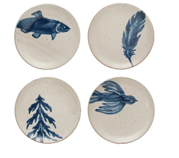 5″ Round Hand-Painted Stoneware Plate w/ Design, Reactive Glaze, Antique White & Blue, 4 Styles