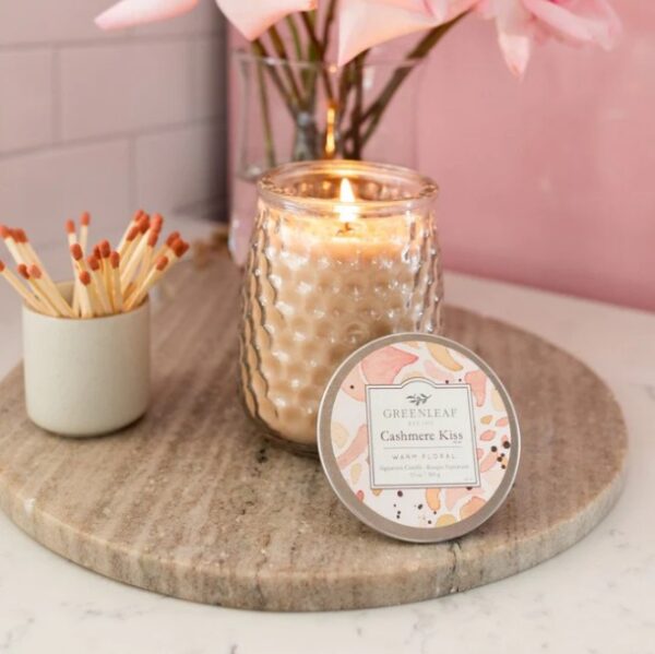 With a clear, glass hobnail textured jar and a silver lid, our Signature Candle is the perfect match for any style. Fill your home with inviting Greenleaf fragrances that make any space feel cozy!