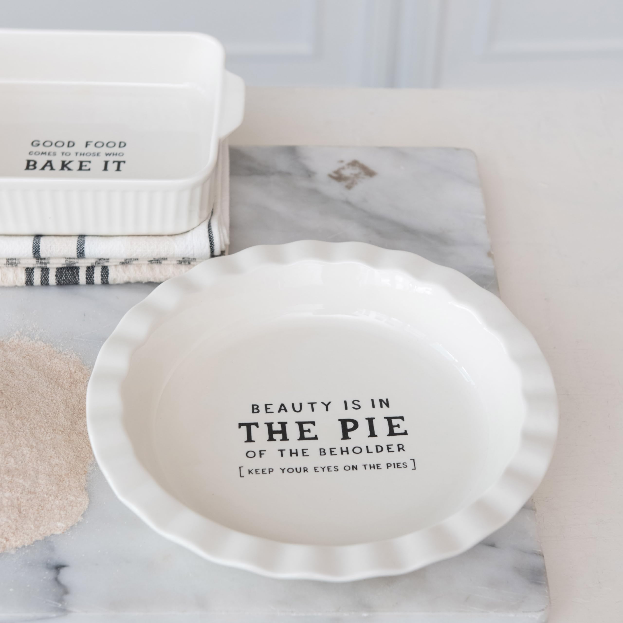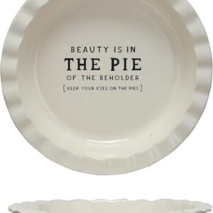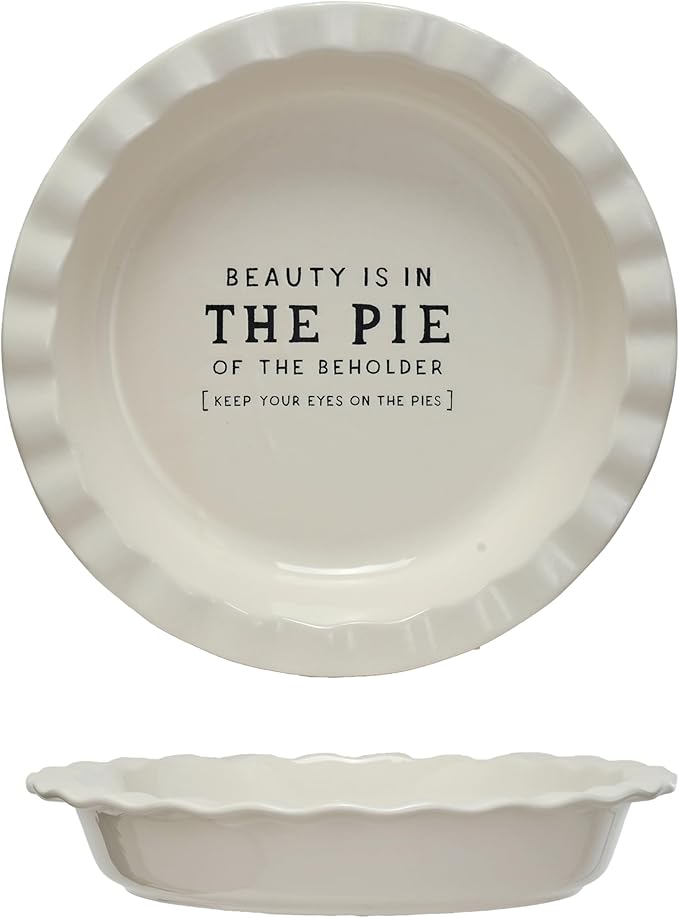 • A whimsical stoneware pie dish that declares “Beauty Is In.. THE PIE,” inviting a smile with every slice served
