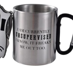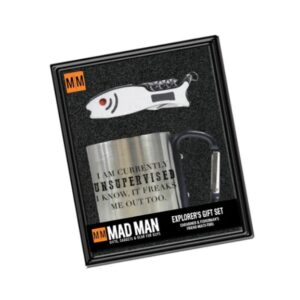 Adventure awaits! Stainless steel mug with carabiner handle. Includes the Fisherman’s Friend multi-tool: bottle opener, corkscrew, Phillips head screwdriver & knife.