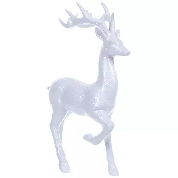 Give your home some shimmery winter charm with this White Glitter Reindeer Figurine! This lovely tabletop statue features a majestic, white reindeer with one leg raised up. Its entire body and large antlers are covered with clear glitter for a frosted look. Pair it with faux-snow accents to transform your space into an alluring winter wonderland.