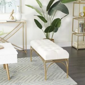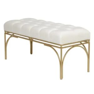 This long cushioned bench features a supple white velvet seat and a polished metallic gold bench. This endearing white velvet bench features a rectangular body structure with a button cushioned velvet seat and four sturdy metal legs with a stunning arched bar design.